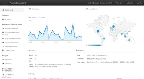 A custom conference management web application with various useful features for conference organisers.